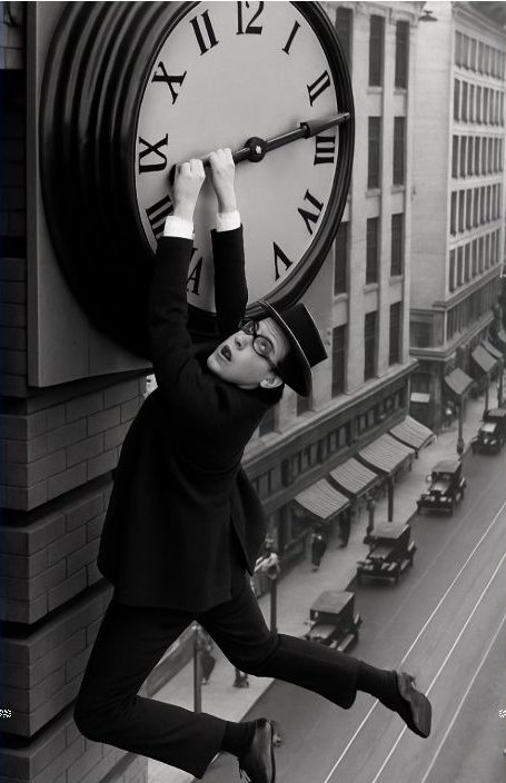 Bild oben: Harold Lloyd in „Safety Last!“ (1923), berühmte Szene mit der Uhr – Sinnbild für Risiko, Balance und das Spiel mit der Zeit in der Großstadt.