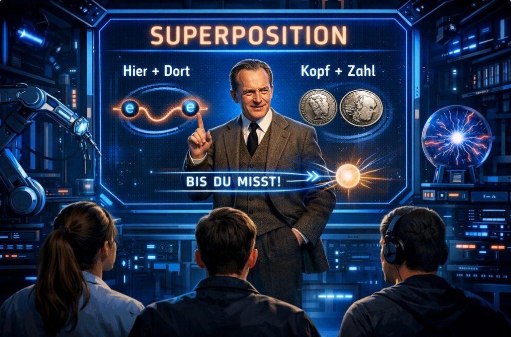 Während eine Münze fliegt, ist sie (anschaulich) noch nicht fest als Kopf oder Zahl entschieden. Erst beim Landen steht das Ergebnis fest. Bei Quanten ist das keine Trick-Idee, sondern beschreibt tatsächlich, dass das Ergebnis erst bei der Messung festgelegt wird.