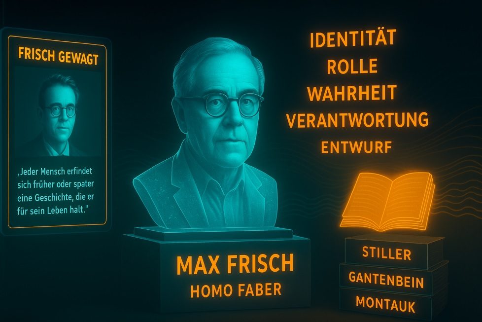 Im Themenfeld Technik & Bewusstsein steht Frisch als literarische Leitfigur: Er begleitet den modernen Menschen durch Rationalisierung, Beschleunigung, Rollenvielfalt – und zeigt, wie leicht wir uns in unseren eigenen Geschichten verlieren.