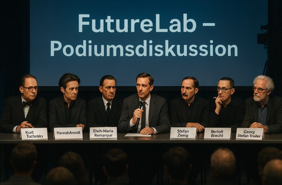 Moderation: Meine Damen und Herren, herzlich willkommen im FutureLab. Heute wagen wir ein Gedankenexperiment: eine fiktive Diskussion mit Autorinnen und Autoren, deren Stimmen die Weimarer Zeit prägten – und die bis heute mahnen.