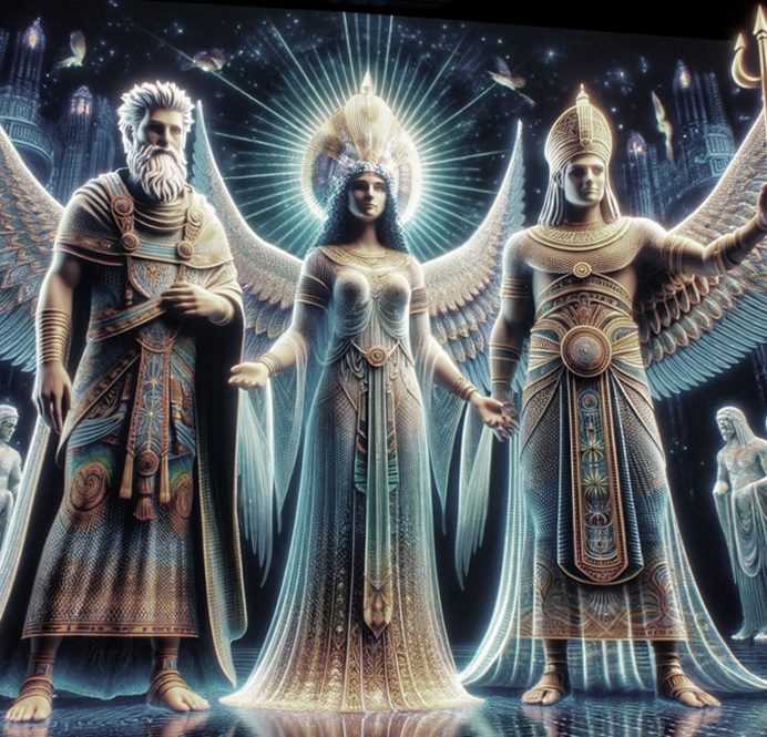 Hinweis (Bildzuordnung): Gilgamesch (der Mann links mit Bart und Kriegerausrüstung) · Ishtar / Inanna (die Frau in der Mitte mit Strahlenkranz und Flügeln – Göttin der Liebe und des Krieges) · Enkidu oder ein anderer Gott wie Marduk oder Shamash (der Mann rechts mit Krone und Zepter)